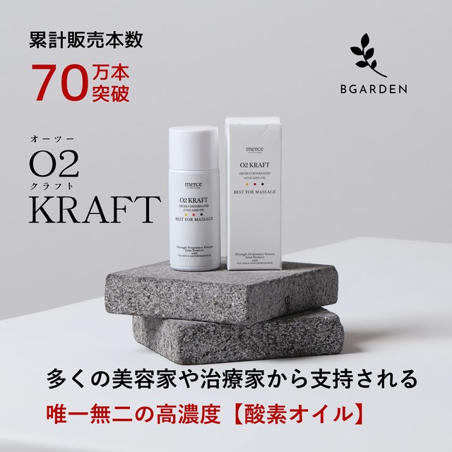 高濃度酸素マッサージオイル!! 加齢や環境の悪化によって減少する“酸素”の摂取量・・・ 高濃度酸素オイルで、不足した酸素を直接体内に届けます。 酸素のチカラ 100%天然植物油に分子レベルの安定を保った状態で高濃度に酸素を含有させ、驚くほどの浸透性で皮膚に吸収されます。ドイツの最先端技術により開発された新しい形の「酸素の力」を、ぜひ実感してください。 (高濃度酸素マッサージオイルとは) 一般的に、酸化とは酸素によって分子レベルが不安定な状態になることで、いわゆる腐るということを意味します。1990 年、ドイツVIA NOVA Naturprodukteは、分子レベルの安定を保った状態で植物オイルに酸素を高濃度に含有させる技術を開発しました。"O2 クラフト"はこの画期的な技術によって安定して、平均150mg Eq/Kg(当社調べ)の酸素を含有しています。 高濃度に酸素を含有したオイルは、皮膚に浸透し体内の酵素によってはじめて酸素と不飽和脂肪酸に分解されその優れた効力を発揮します。 ★Bgardenは、正規販売代理店となります。