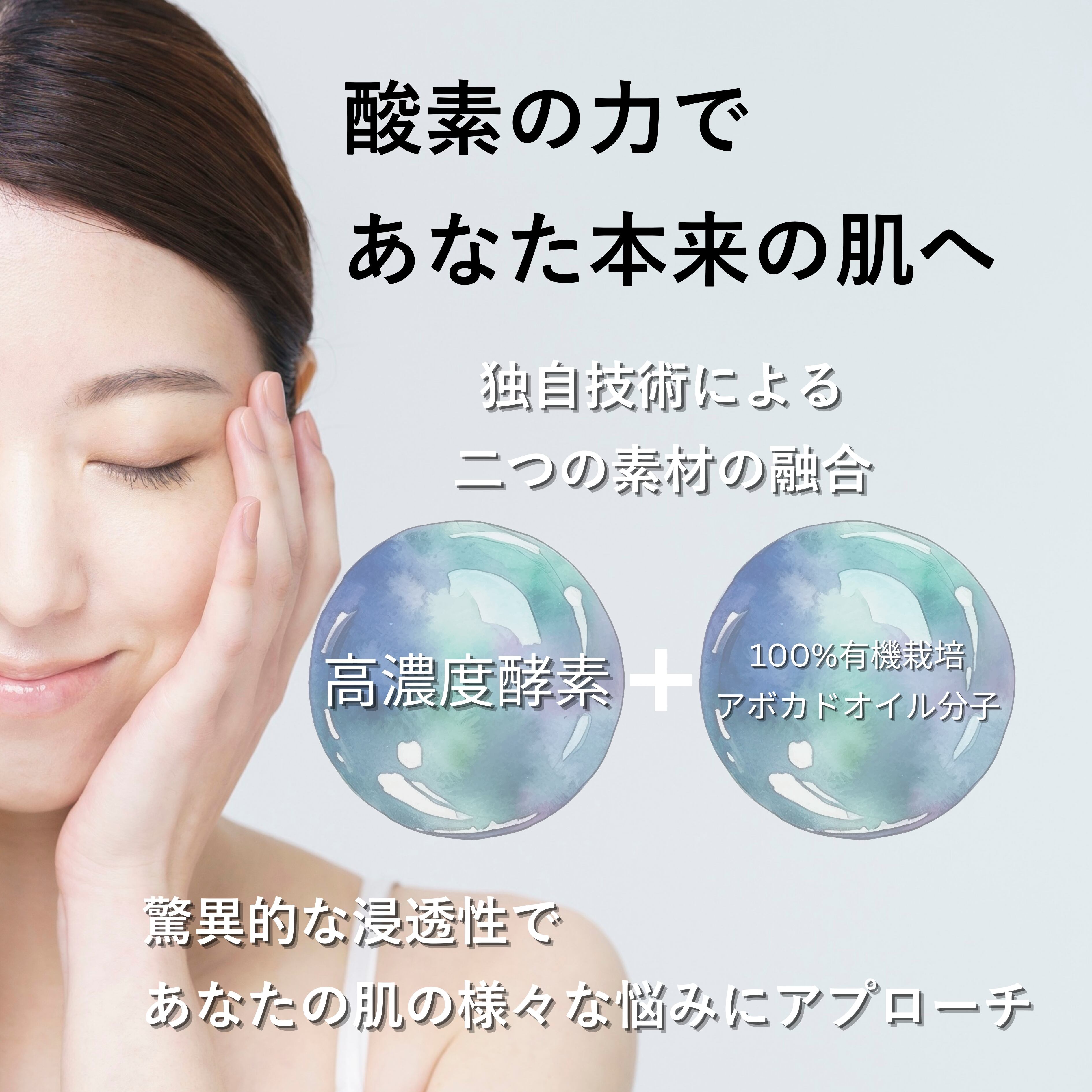 100%天然植物油に分子レベルの安定を保った状態で高濃度に酸素を含有させ、驚くほどの浸透性で皮膚に吸収されます。ドイツの最先端技術により開発された新しい形の「酸素の力」を、ぜひ実感してください。